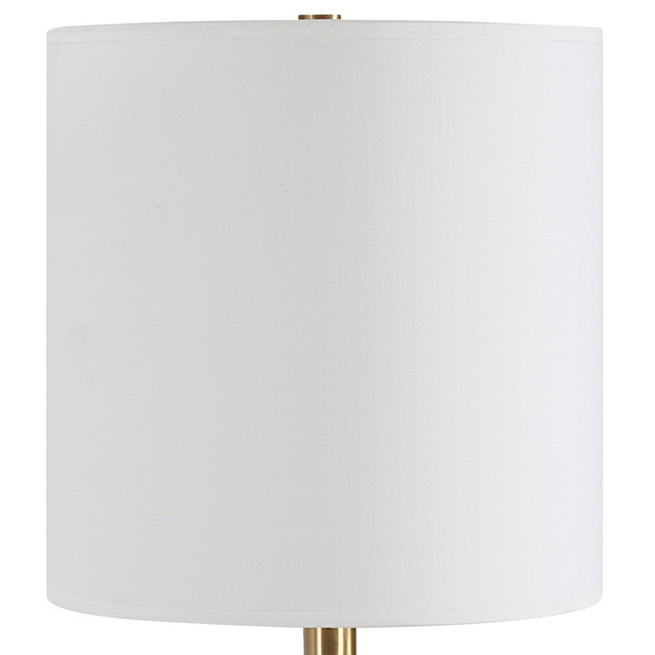 This multifunctional lamp highlights a slim metal base in plated brass, accompanied by legs wrapped in rattan. Its petite round drum shade is made of a pristine white linen fabric.