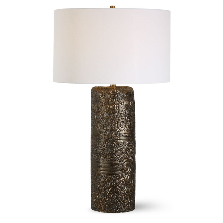 Transform your space with the charm of nostalgia embodied in our ceramic table lamp. Its whimsical carvings and asymmetrical column shape evoke the essence of a cherished found object. Finished in a distressed aged bronze and accented with plated brass details, it exudes timeless elegance with a touch of vintage allure. The round hardback drum shade is a crisp white linen fabric.