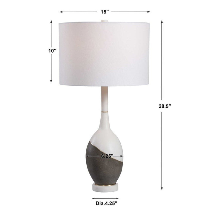 Simple yet sophisticated, this table lamp features a combination of honed charcoal concrete and a polished white marble look, accented by brushed gold plated accents. The lamp is complimented by a crisp white hardback drum shade.