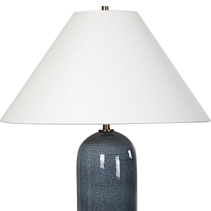 This Ceramic Table Lamp Features a Deep Blue Glaze with Textural Undertones and Antique Brass Accents. The Handcrafted Fired Glaze May Vary in Finish and Size. A White Linen Fabric Shade Completes the Look.