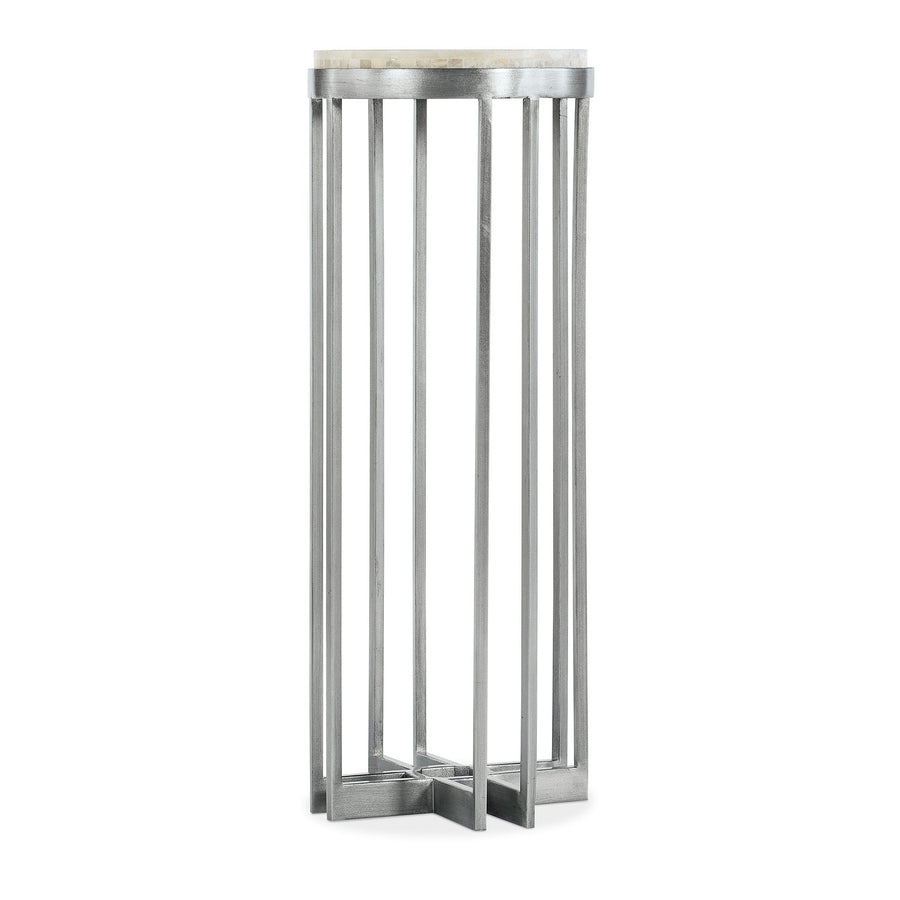 The Marin Accent Table blends modern elegance with organic charm, featuring a round onyx top and geometric pewter metal base for a stylish, space-saving design.