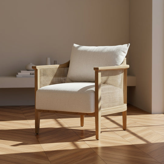 Enrich your living room arrangement with the captivating Miera Occasional Chair, a stunning accent piece designed to embrace a modern coastal flair. Meticulously handcrafted in Indonesia by master furniture makers, this chair showcases an impeccable fusion of natural mindi wood, exquisite rattan materials, and a sophisticated off-white fabric. The gracefully curved backrest and a lavishly upholstered cushion, ensures optimal comfort and leisure for your home.