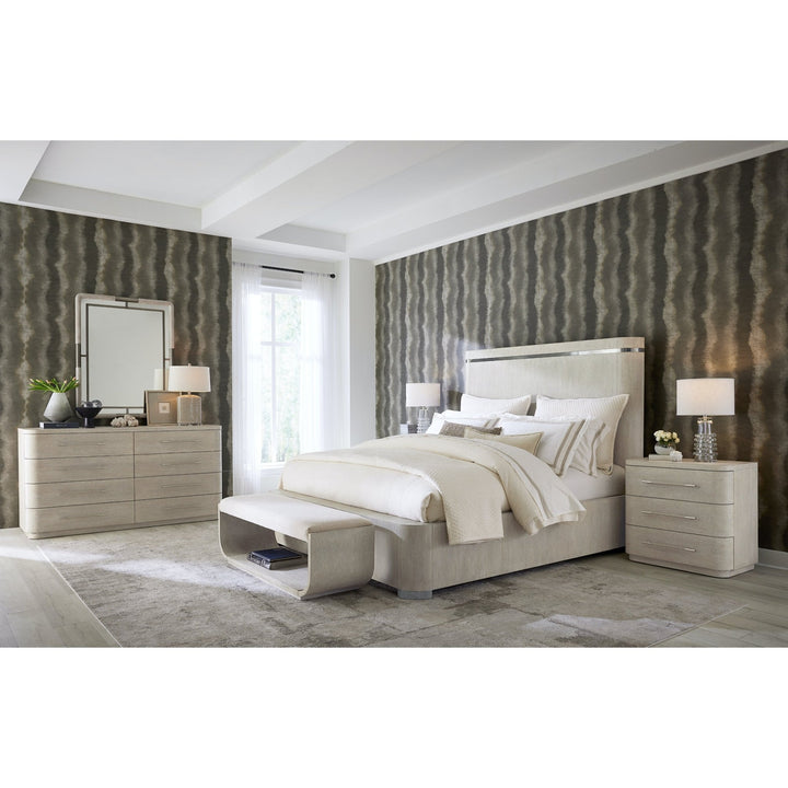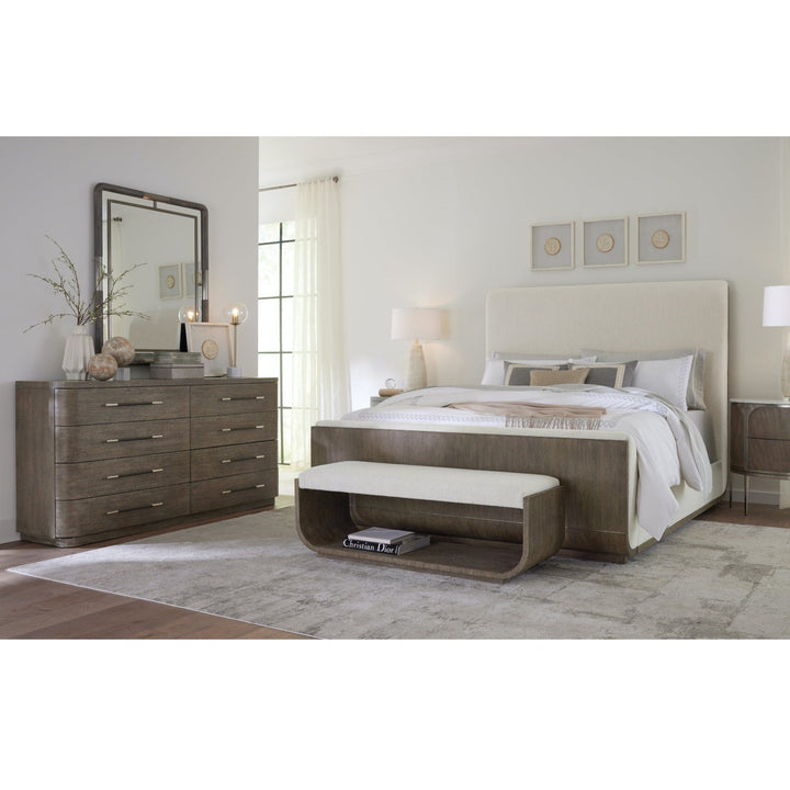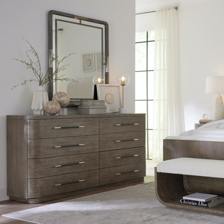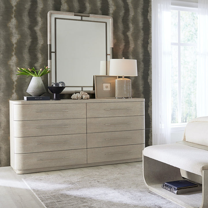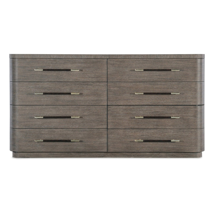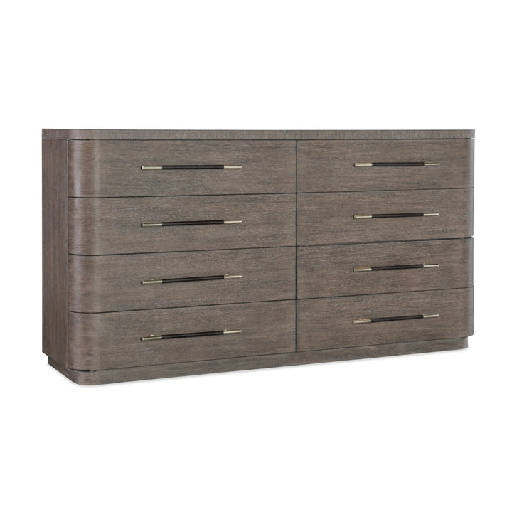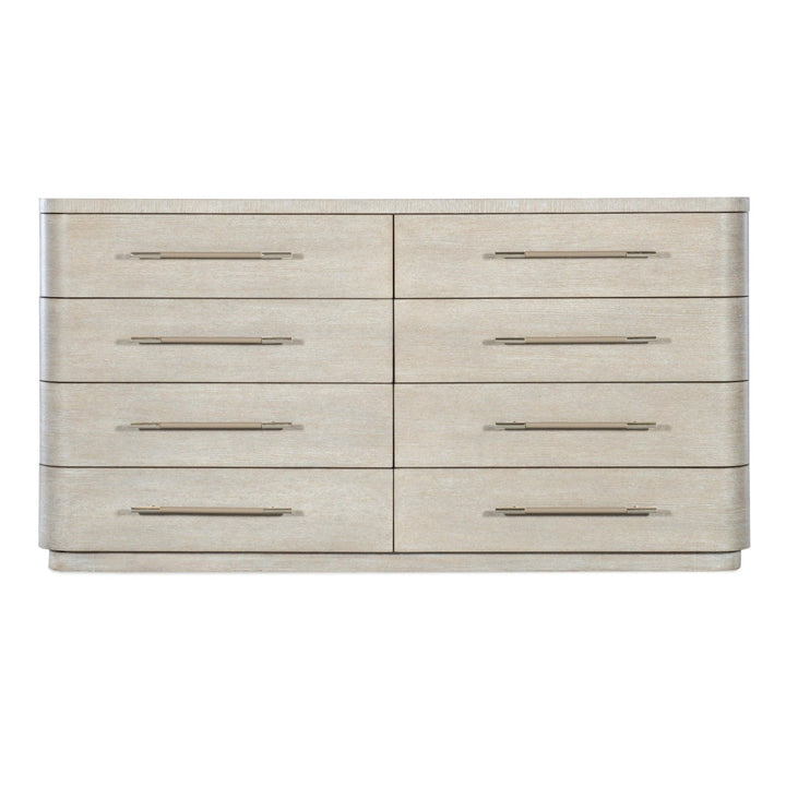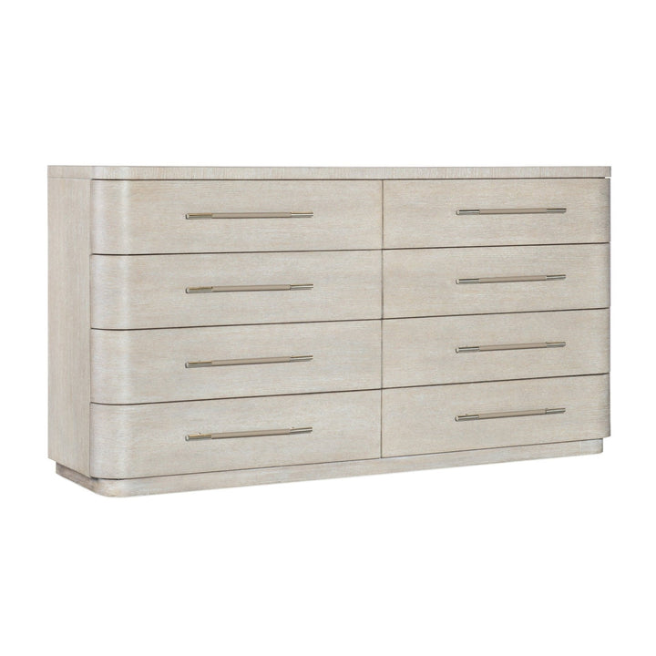 Softly sophisticated with a clean modern profile and luxe mixture of materials, the Modern Mood Dresser is a stunning statement piece. The case has rounded corners and a plinth base and offers 8 self-closing drawers. The top two drawers have drop-in felt liners, there’s a removable jewelry tray in the top right drawer and the bottom two drawers are cedar-lined. Crafted of Oak Veneers, the dresser and accented by metal pulls wrapped in leather.
