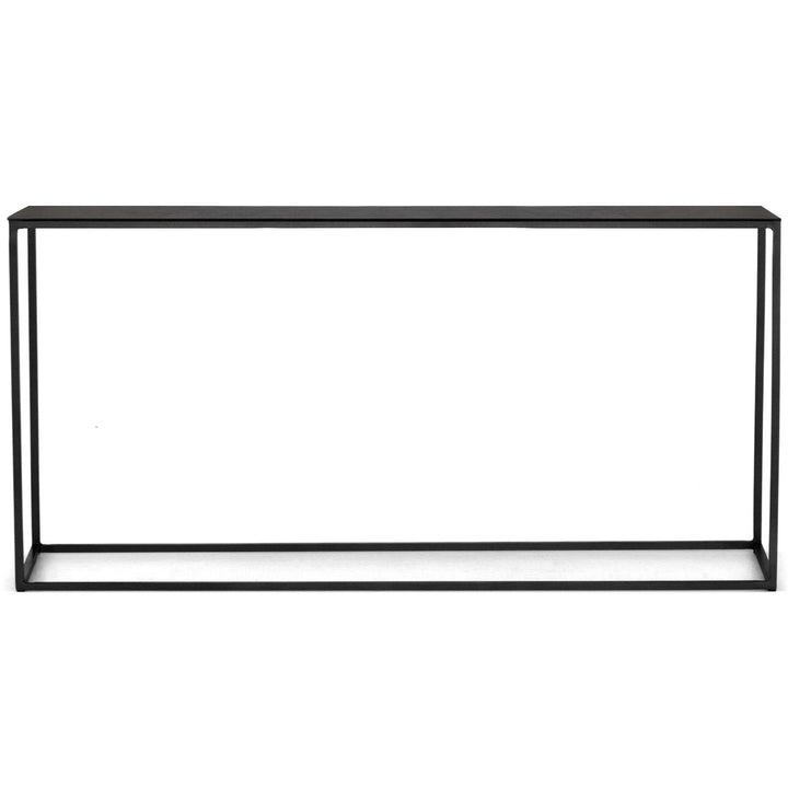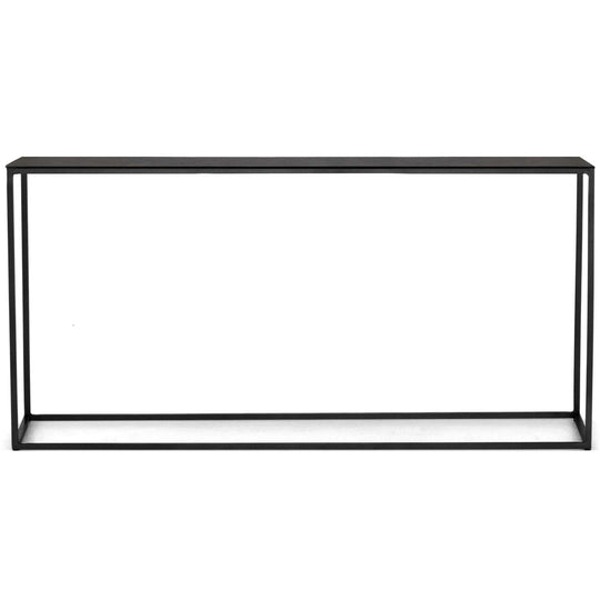Simplistic industrial style console table, constructed in an aged black iron featuring a cast textured aluminum slab top finished in a plated antique bronze.