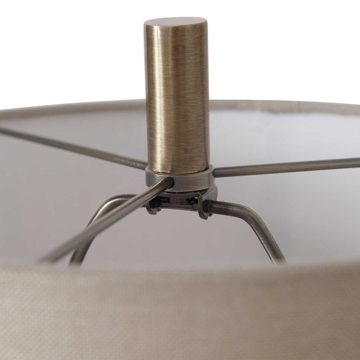 This buffet lamp features a delicate design with traditional elements that showcase polished white marble details, paired with antique brass plated accents. The round hardback shade is a warm khaki linen fabric.