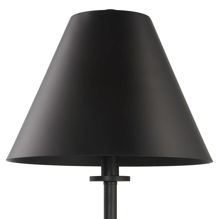 The Pilot Buffet Lamp displays a slender metal construction finished in satin black with a coordinating metal empire shade and an elegant black marble foot with natural white veining.