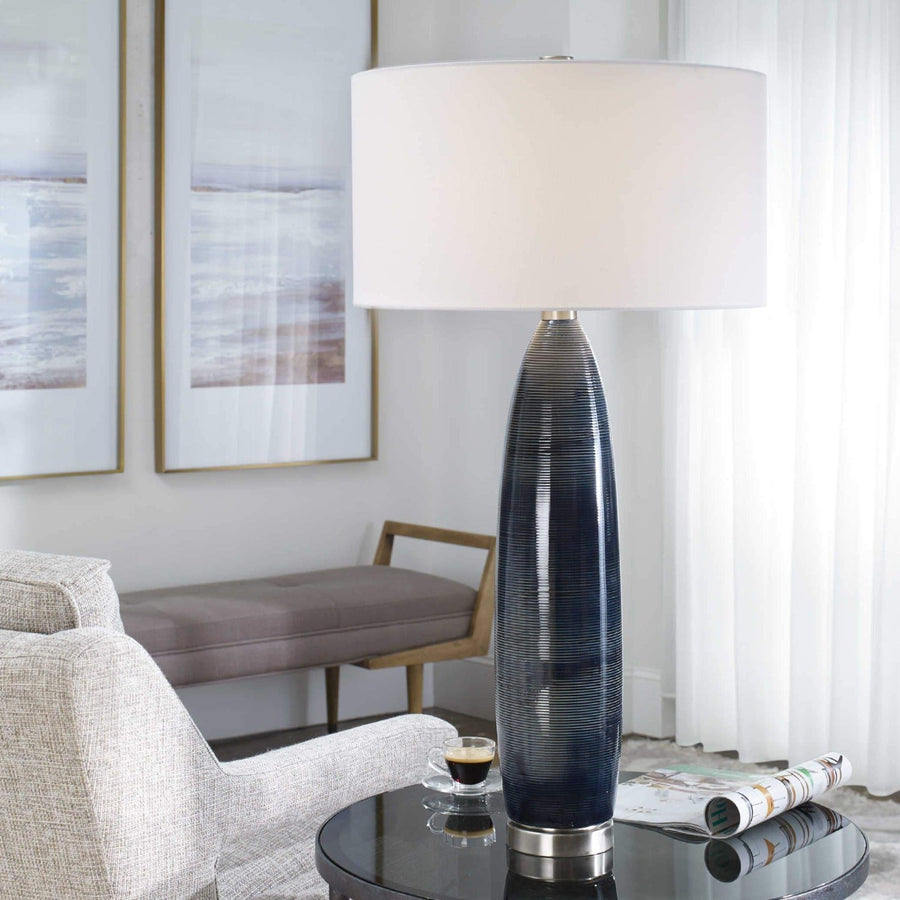 This handcrafted ceramic table lamp showcases an elevated look with a striped motif and a Prussian blue-gray glaze. Brushed nickel plated iron details accentuate the design. The hardback drum shade is covered in a white linen fabric.