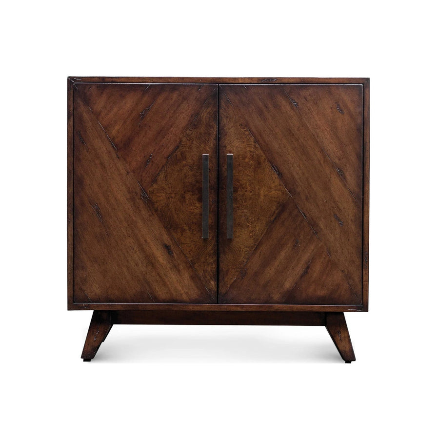 Mid century inspired styling, with geometrically pieced mango veneer doors accented with an ash burl veneer center finished in a deep mahogany stain with natural distress marks and burnishing, complete with antique brass finished bar handles. Includes one adjustable interior shelf.