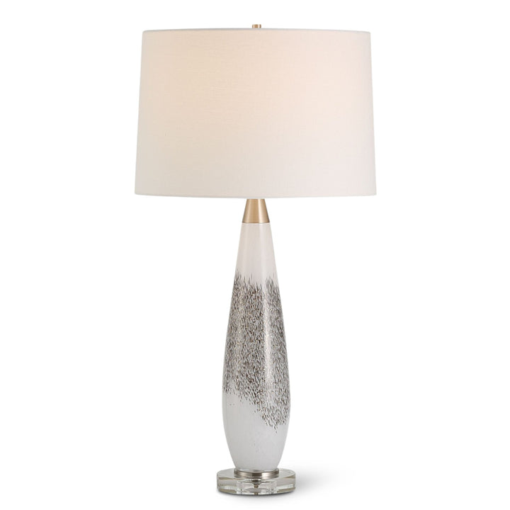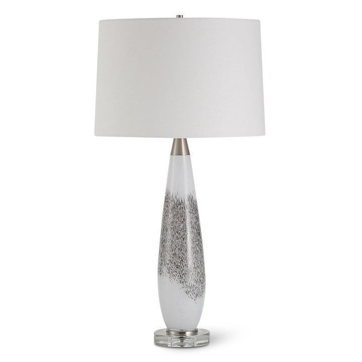 The table lamp boasts a refined design with slender glass base, featuring a brilliant white background and mottled gray and metallic silver details. A thick crystal foot and plated brushed nickel accents add a touch of elegance.