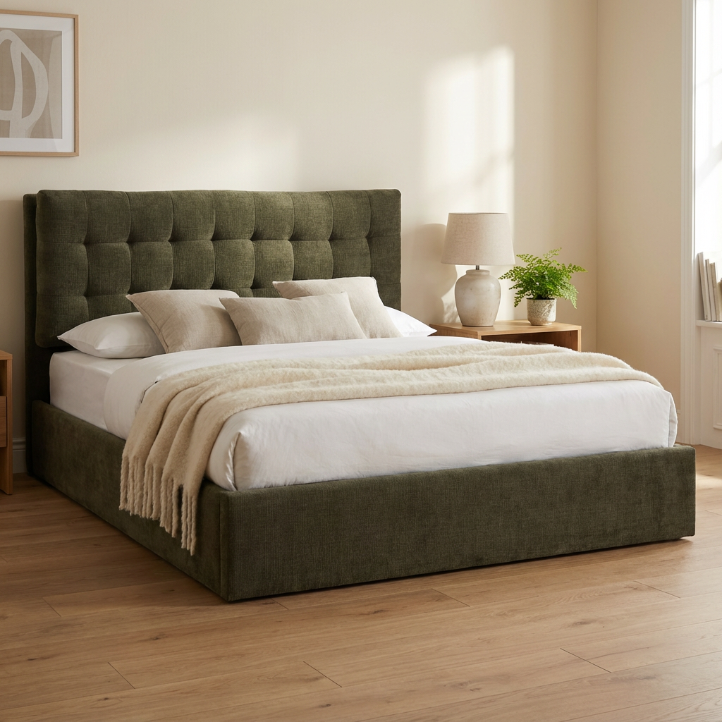 Solid wood, plywood & MDF construction with polyester upholstery, foam headboard, & a lift-up storage piston: 800N