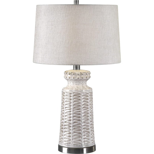 Embossed ceramic, featuring a subtle tribal pattern, finished in a lightly distressed glossed white glaze, accented with brushed nickel plated details. The slightly tapered round hardback shade is a light gray beige linen fabric. Due to the nature of fired glazes on ceramic lamps, finishes will vary slightly.