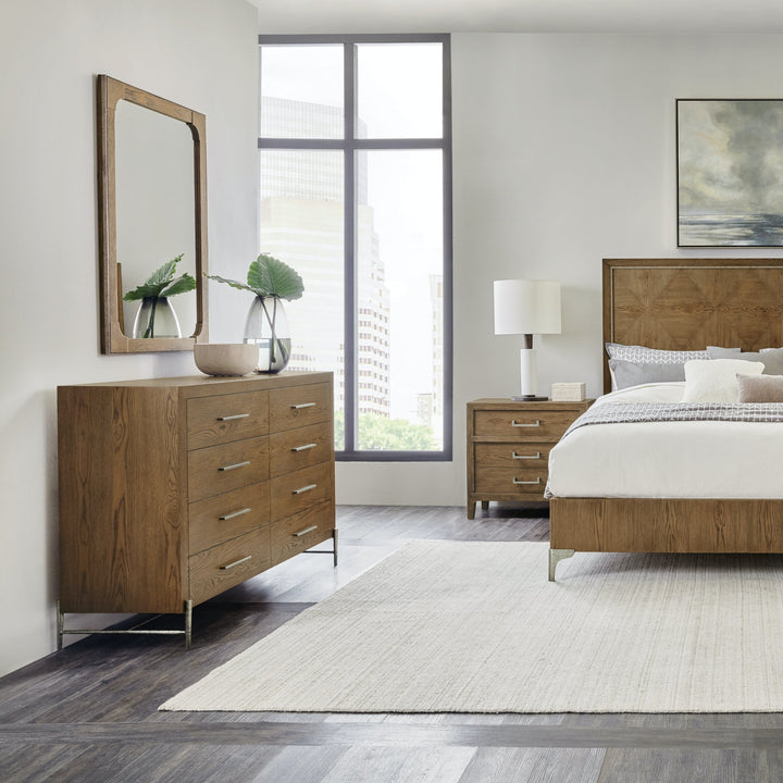 Inspired by downtown urban living, the Sorell Eight-Drawer Dresser combines craftsman style with modern design elements. Constructed of White Oak Veneers in a warm brown finish, the dresser is accented by jewelry-like forged pewter custom hardware and is on raised, slender metal legs with a stretcher in a cool contemporary pewter color. The 8 drawers have soft-close drawer guides, the top left drawer has a gray removable felt liner and the top right drawer has a removable felt jewelry tray. Both bottom drawers are cedar-lined.