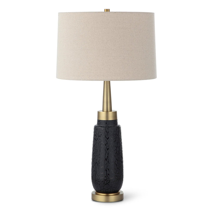 The SPYGLASS table lamp boasts a sleek black glass base etched with a polished woodgrain-like design, complemented by antique brass plated accents. Its round hardback shade is elegantly covered in a light beige linen fabric, adding a touch of sophistication to any space.