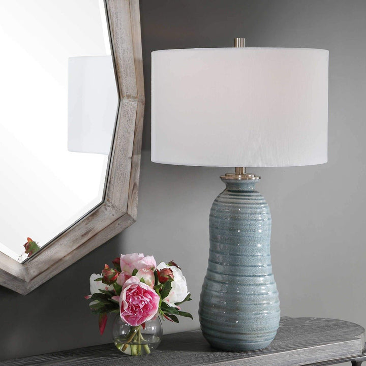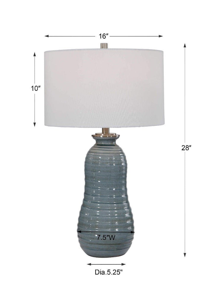 This ceramic table lamp has a tapering ribbed surface that's finished in a light blue crackled glaze, accented with brushed nickel details. A hardback drum shade in white linen compliments this piece. Due to the nature of fired glazes on ceramic lamps, finishes will vary slightly.
