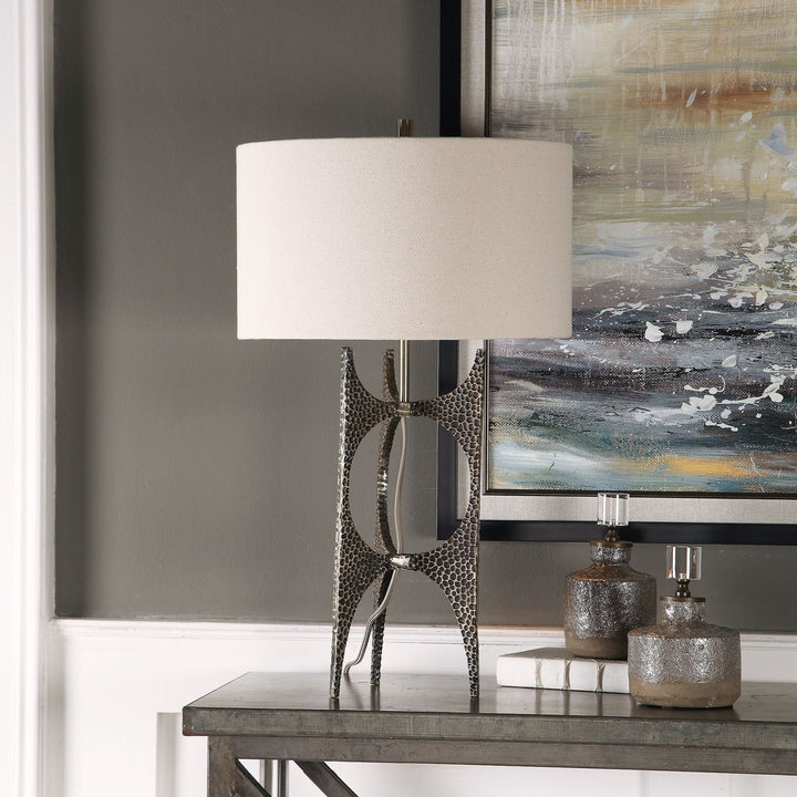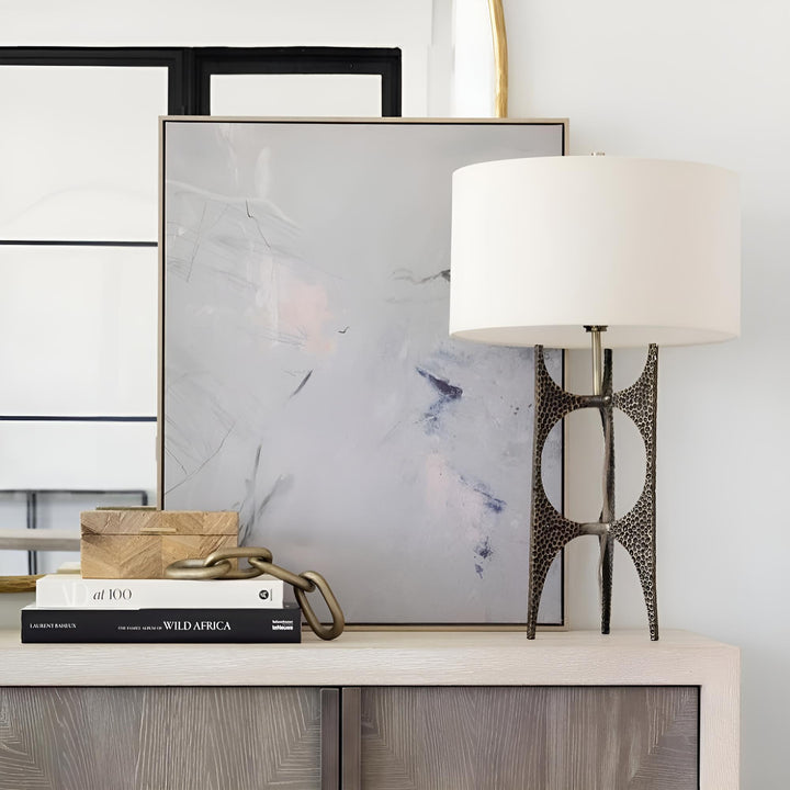 This contemporary design is formed from cast iron featuring a deep hammered texture, finished in a heavily antique golden bronze, paired with an exposed fabric covered cord. The round hardback drum shade is white linen fabric.