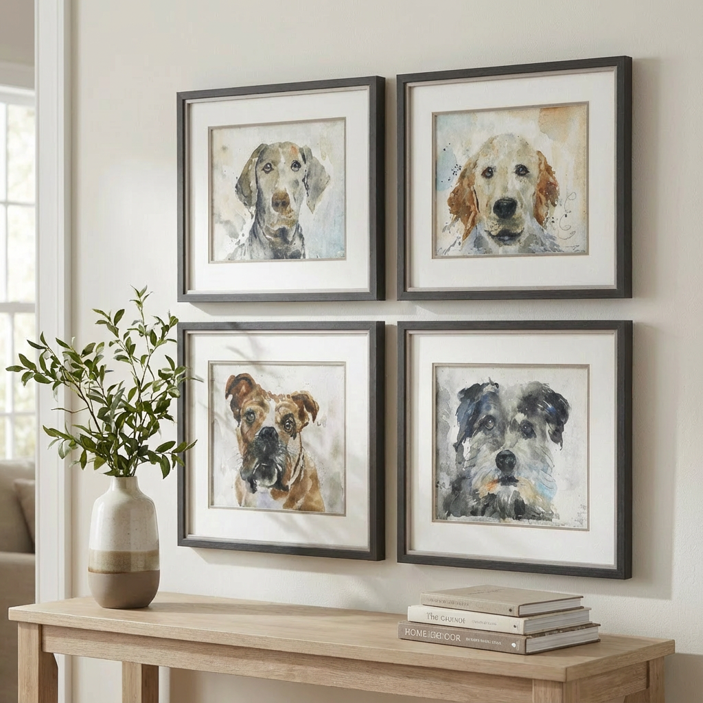 Celebrate canine charm with this curated collection of four framed prints, each capturing distinctive dog personalities through delicate watercolor artistry. The set combines aesthetic sophistication with practical presentation—every piece arrives matted on textured white paper with refined gray accents and a streamlined black frame. Glass protection ensures longevity while maintaining visual clarity. An ideal choice for dog enthusiasts seeking gallery-quality wall décor that balances artistic expression with timeless design sensibility.