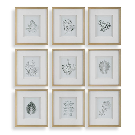 This collection features nine framed botanical prints that introduce natural elegance to your interior. Each delicate illustration is mounted on double cream mats and encased in a gallery frame finished in gold. The artwork is protected beneath clear glass, ensuring lasting beauty and preservation.