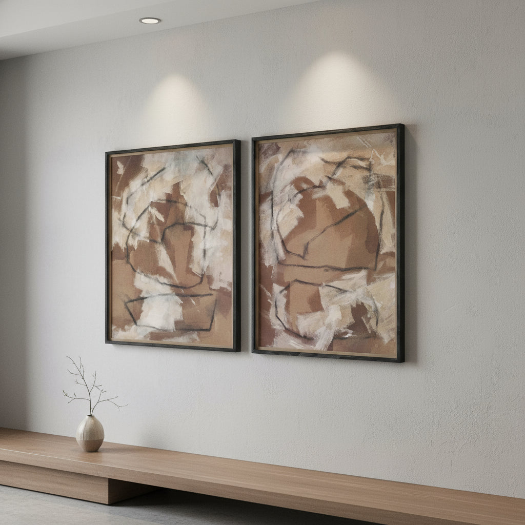 This striking two-piece collection showcases contemporary mixed media abstracts unified by warm brown palettes and refined black detailing. Each composition conveys kinetic energy through deliberate compositional choices, while the pairing creates visual dialogue across your space. The coordinating black frames with natural wood liners deliver sophisticated contrast and architectural presence.