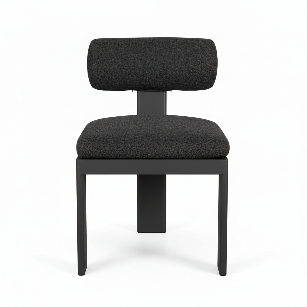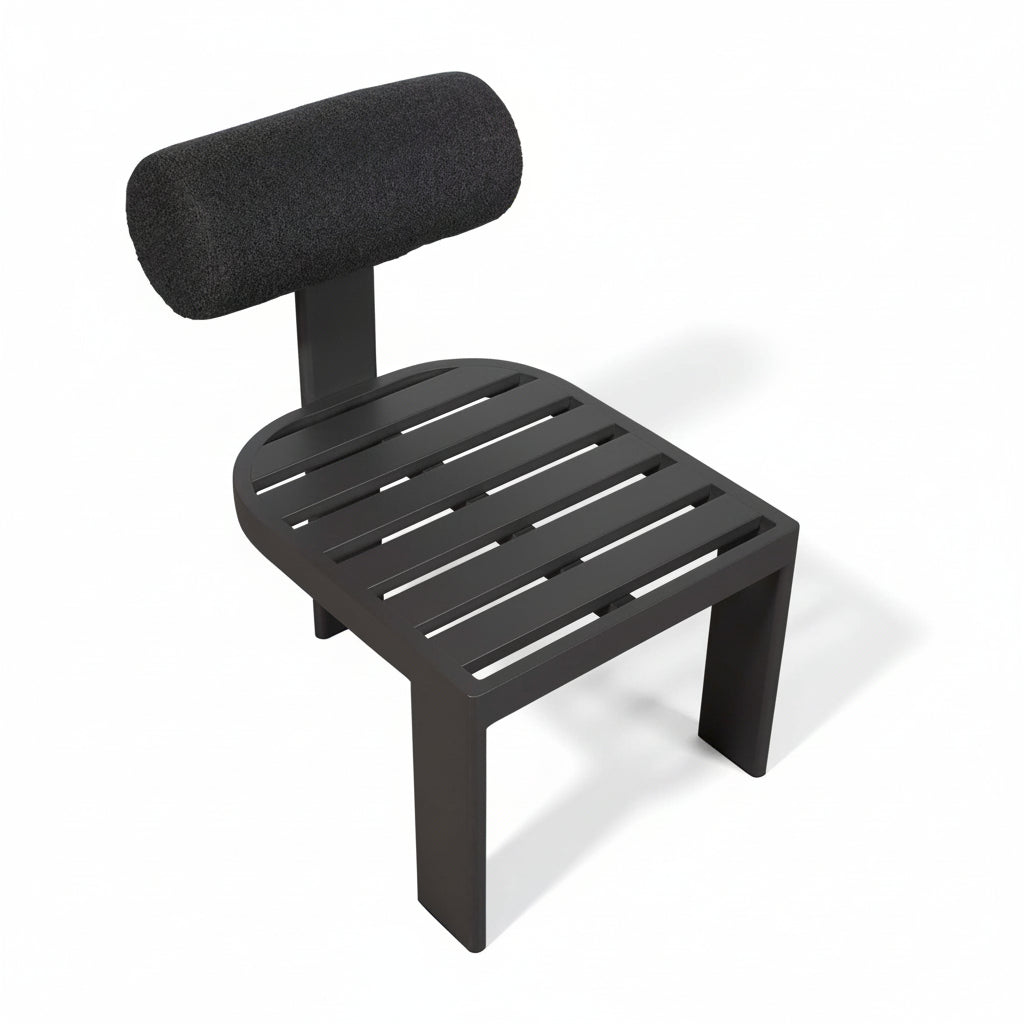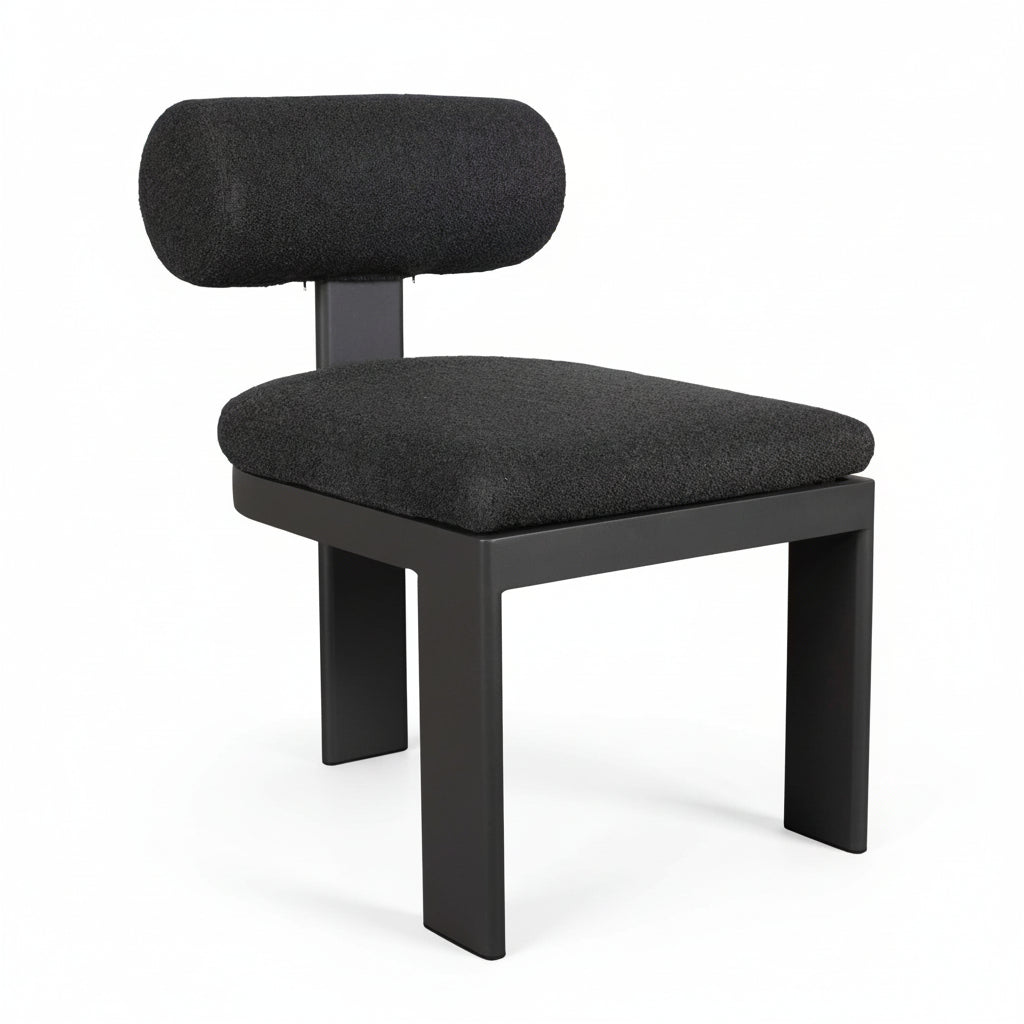 This outdoor dining chair combines modern aesthetics with practical durability. Its lightweight aluminum frame, finished in Java Black powder coating, supports a distinctive floating bolster back pillow for ergonomic comfort. The charcoal boucle upholstery uses solution-dyed acrylic fabric engineered to resist moisture, UV fading, and environmental soiling—ideal for sustained outdoor exposure. Perfect for contemporary patios seeking refined style without compromising on weather resistance.