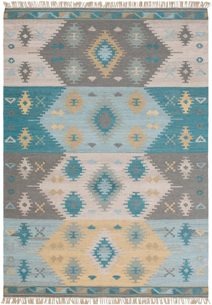The graphic pattern of the Delsin Rug is reminiscent of traditional kilims. A neutral base spotlights tones of aqua and sage with cotton tassels for added flourish. Perfect for adding a layer of color and pattern to any room.