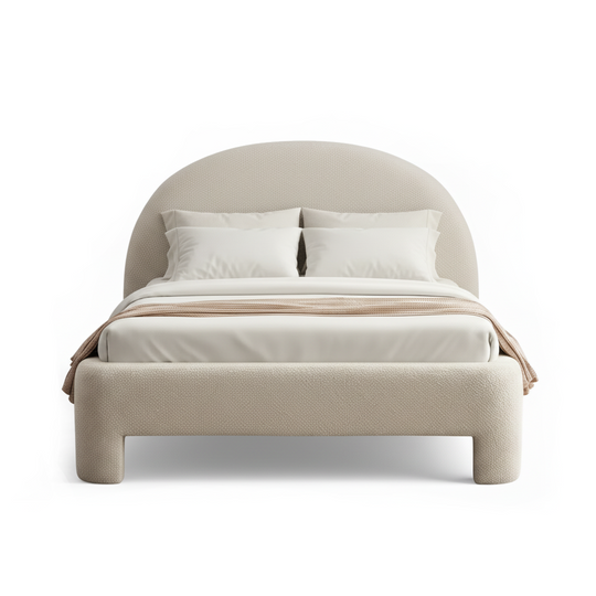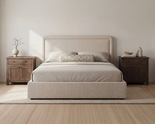 The bedroom is shaped through distinct motifs. Beds range from organic modern platforms in oak and acacia to upholstered bouclé forms with sculptural profiles. Dressers & chests carry vintage-inspired lines, live-edge wood, and minimalist silhouettes. Nightstands balance function with eclectic detail, while armoires & wardrobes rise as architectural storage with timeless proportion. The composition settles on rugs, grounding the room with texture and continuity.