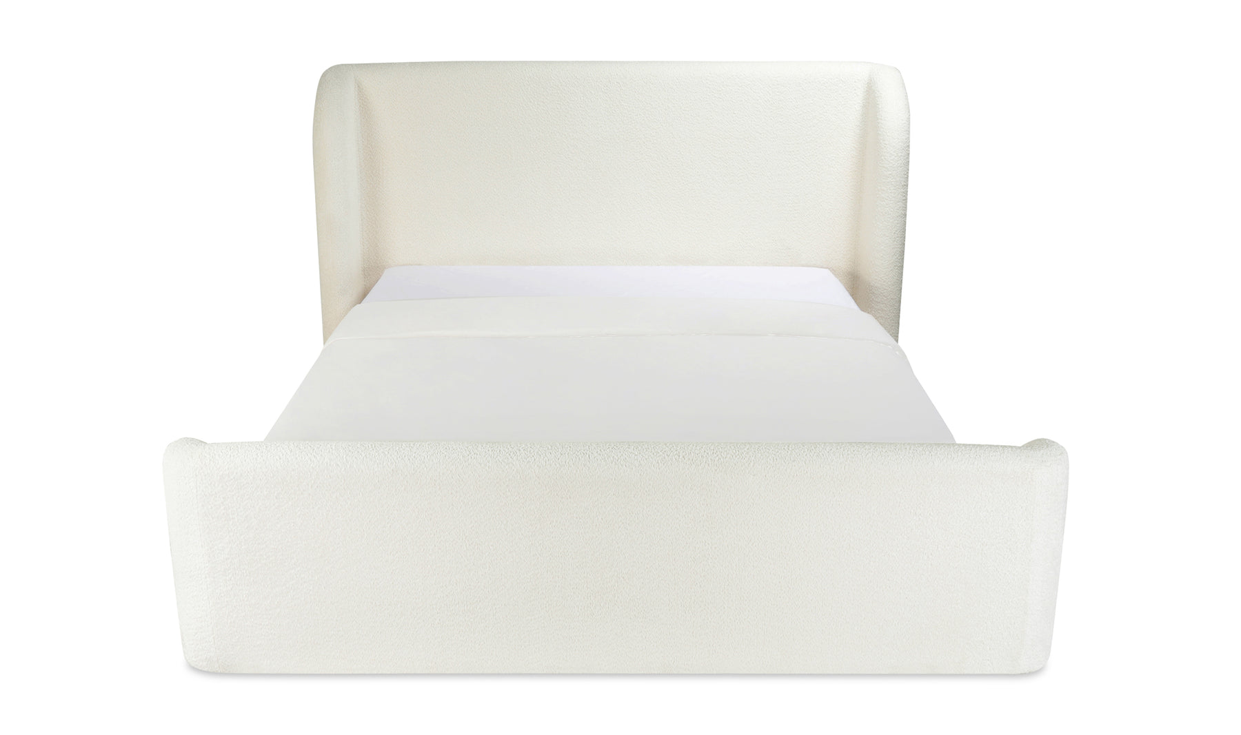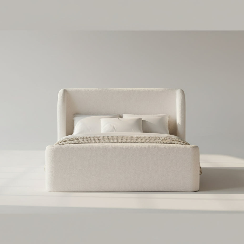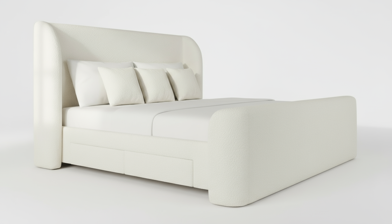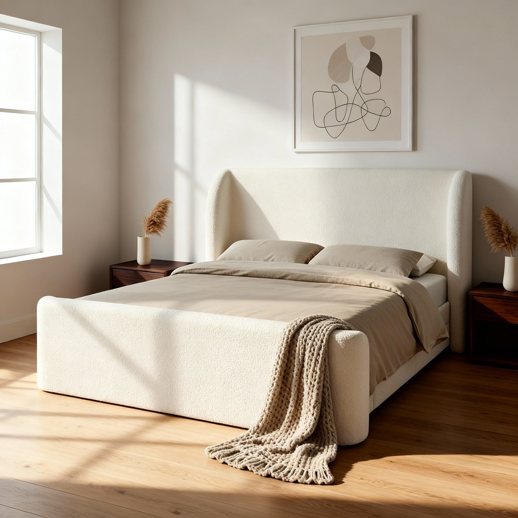 Wrapped Comfort: Headboard and footboard form an embracing frame with padded panels and soft lines, creating a grounded centerpiece that encourages intentional unwinding and everyday relaxation.