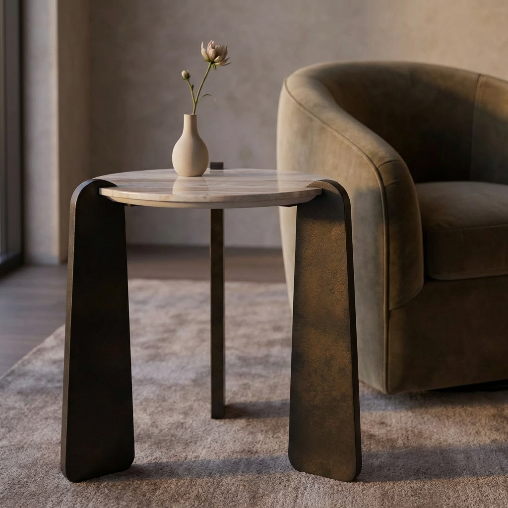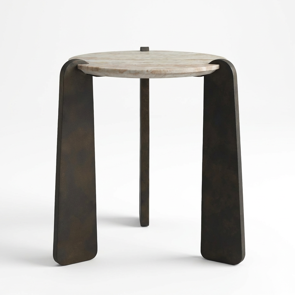 Elevate your living space with this sophisticated side table, where natural marble meets industrial design. The tabletop displays distinctive veining across white, gray, sand, and brown hues, while sturdy textured iron legs in aged dark bronze provide a striking contrast. As with all genuine marble pieces, subtle variations in pattern and tone make each table uniquely yours—a hallmark of authentic craftsmanship and quality materials.