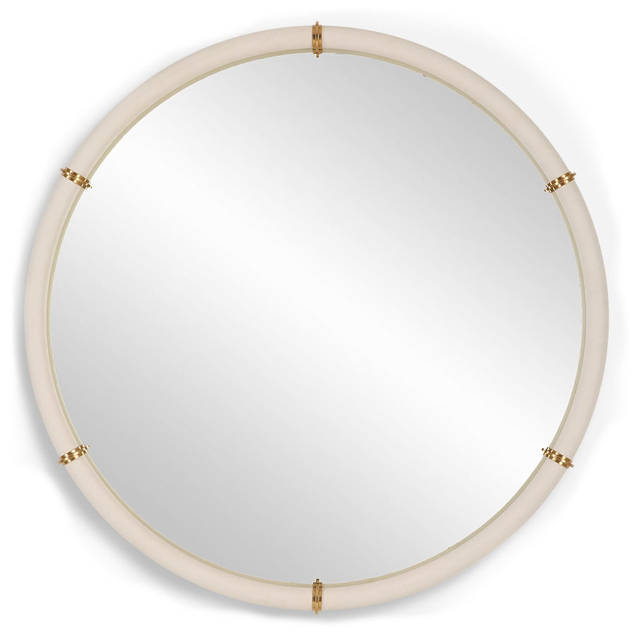The Cyprus round mirror showcases a white faux shagreen leather wrap featuring brass plated steel bands that help elevate this sophisticated design.