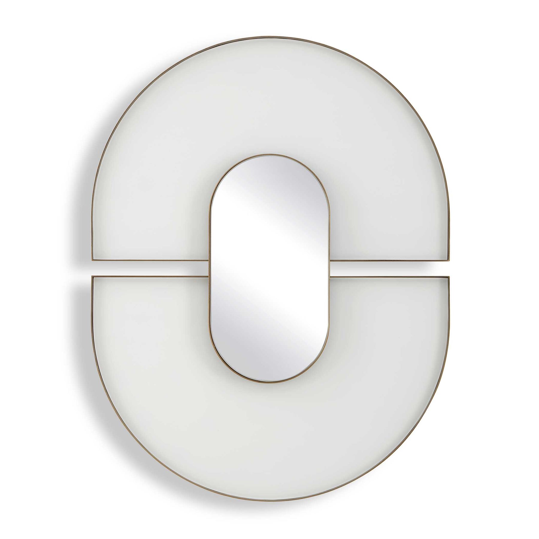 The Encase Oval Mirror Features A Striking Design With Two Semicircular Sections Of White Glass, Each Encased In A Sophisticated Antique Gold Iron Frame, Surrounding A Raised Center Mirror. May Be Hung Horizontal Or Vertical.