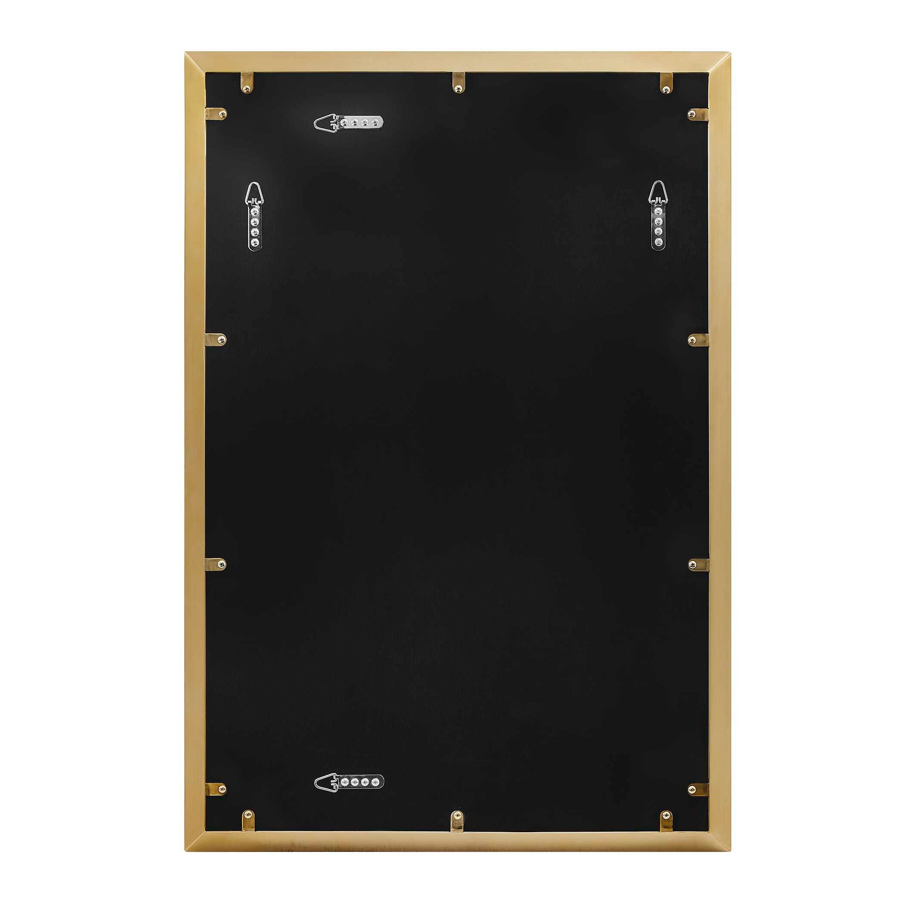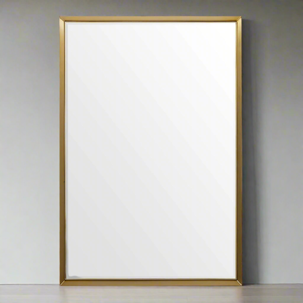 This elegant rectangular mirror showcases a stainless steel frame with a distinct angular design and a slim inner liner, all finished in plated brushed brass. It is designed for versatile installation, allowing for both horizontal and vertical mounting.