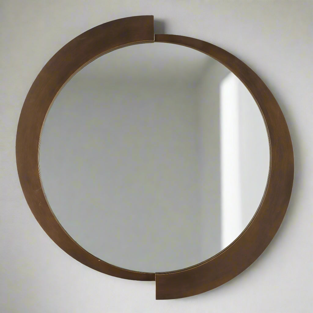 The Reverse Round Mirror showcases a three-dimensional iron frame with a brushed bronze finish highlighted by subtle champagne tones. Its contemporary style combined with a classic finish creates an elegant and distinctive focal point.