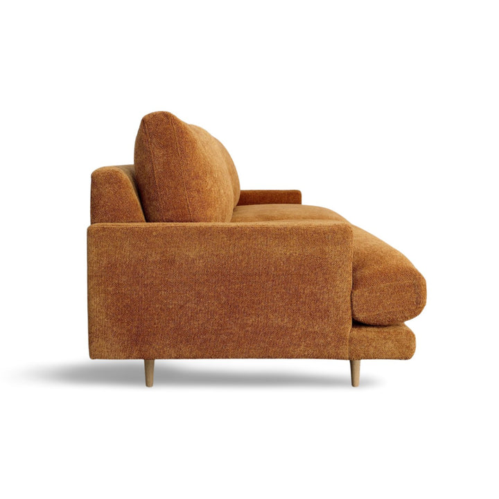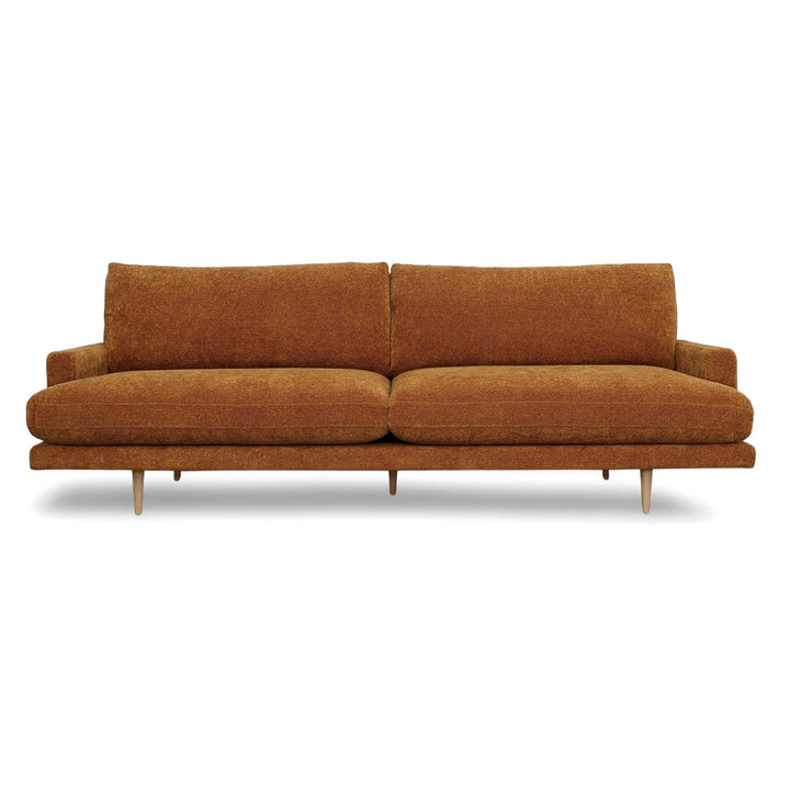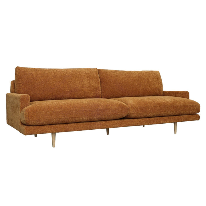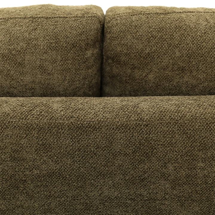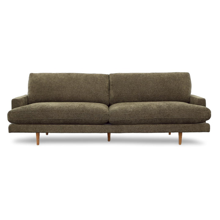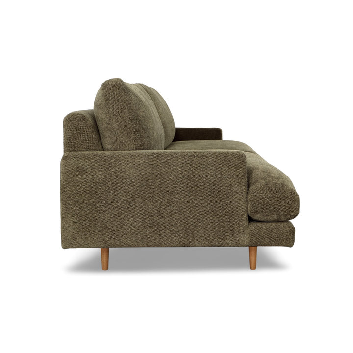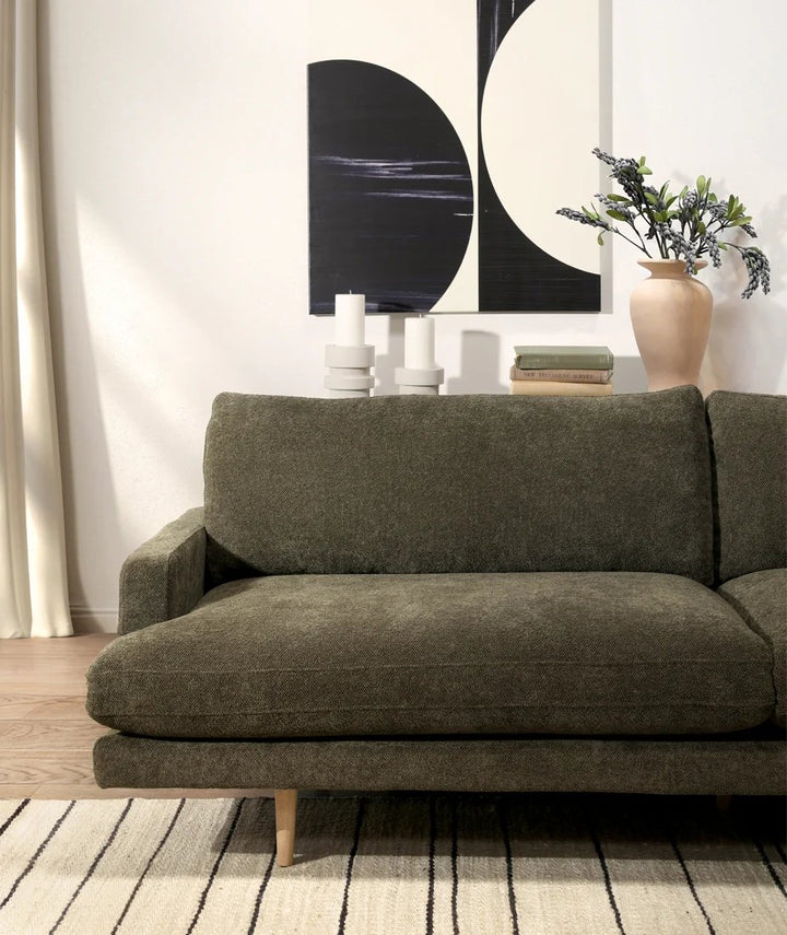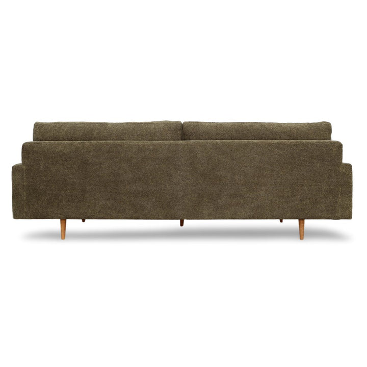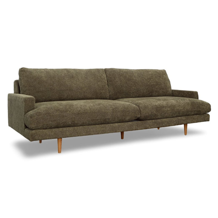 An elegant design that will instantly elevate your living room arrangement with high-quality fabrics that bring modern simplicity to any space. Featuring a nice combination of chenille poly blend upholstery in a dark olive green color and natural wooden legs made from solid pine. Its classic frame highlights the beautiful spacious seat, accented by its minimal armrest for a luxurious feel. The Antonio Sofa was delicately handcrafted in Mexico by talented artisans who apply the finest quality materials and craftsmanship for superior style.
