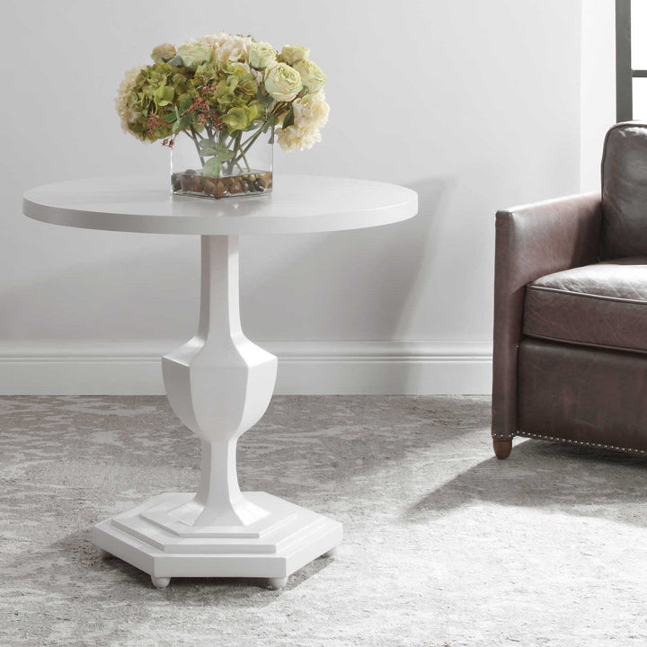 Showcasing a geometric shaped base, this traditionally inspired foyer table is finished in gloss white giving it an updated modern feel.