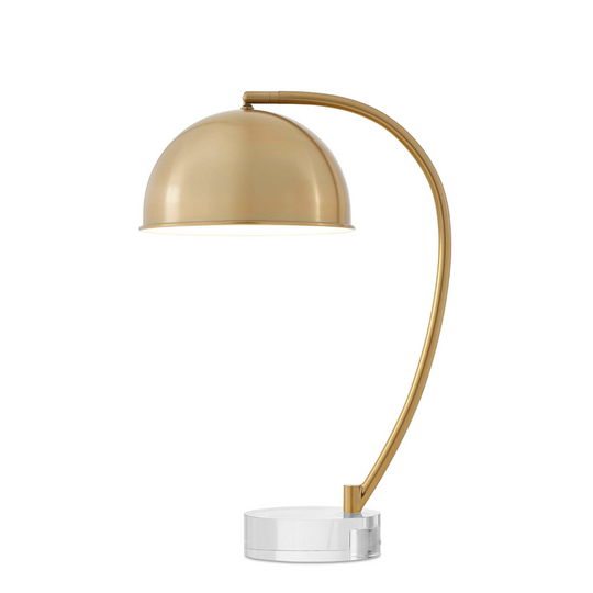 This solid concrete column base features a polished surface finished in a bleached wash, accented with a thick crystal foot, and brushed brass plated details. The round hardback drum shade is a white linen fabric.