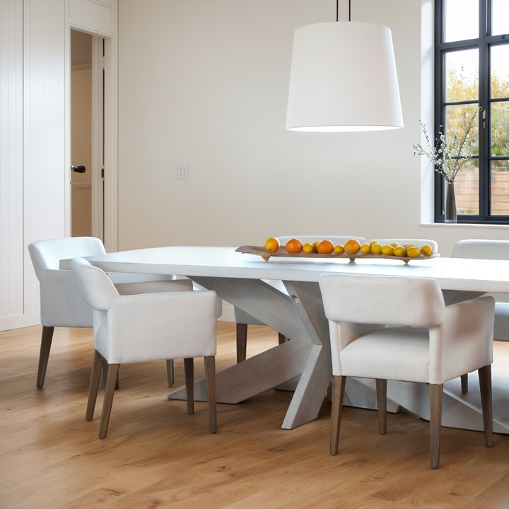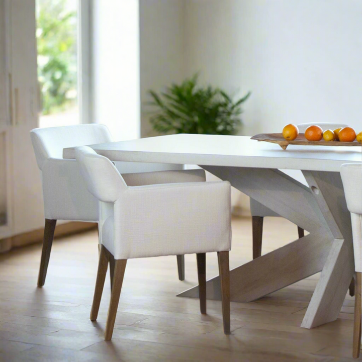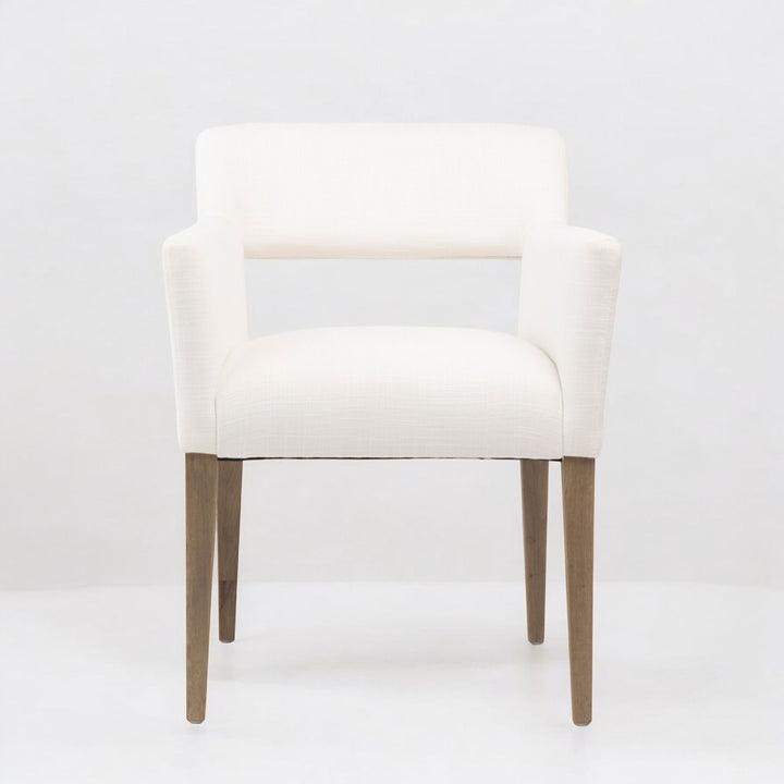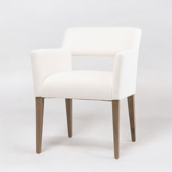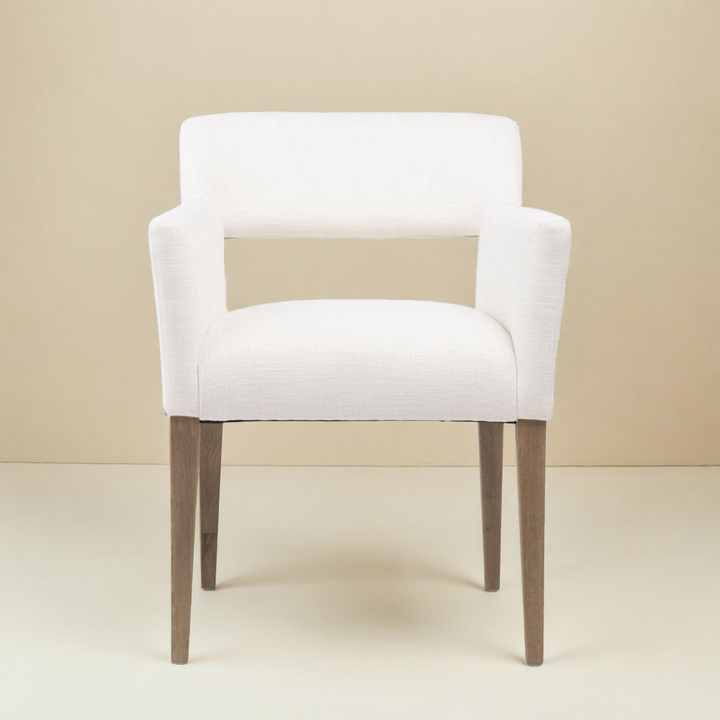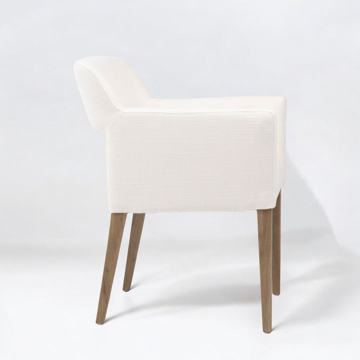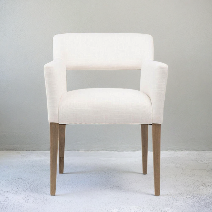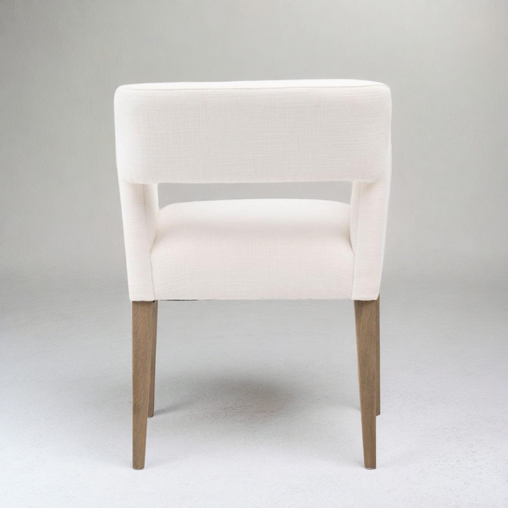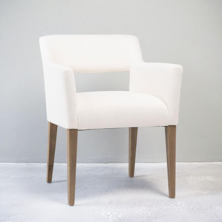 Designed with gently curving lines, this dining chair features a mid-open-back silhouette and soft, cotton blend upholstery. The smooth oak wood legs in a brushed-brown finish create the perfect look that fits in any transitional décor. Offering minimalist elegance and plush comfort whether drawn up to your dining table or simply adding an extra seat in your living space.
