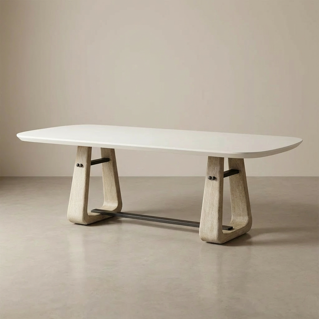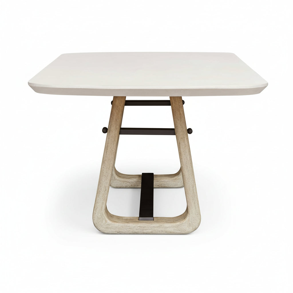 The Ciro Concrete Dining Table brings contemporary elegance to outdoor entertaining spaces. Its robust glass-reinforced concrete surface delivers exceptional durability while maintaining a refined aesthetic. Anchored by cerused wheat mahogany legs and complemented by distinctive java black metal accents, this table strikes a sophisticated balance between modern design and timeless craftsmanship.