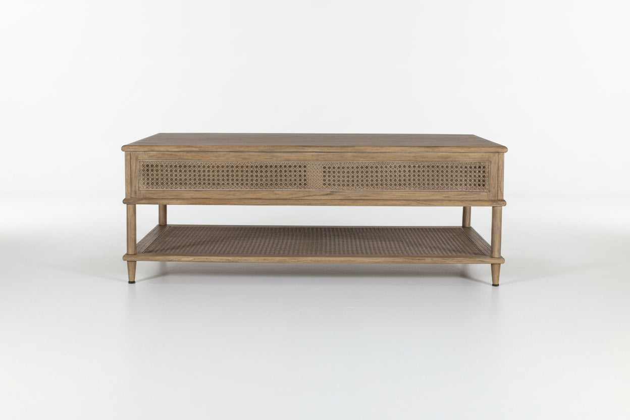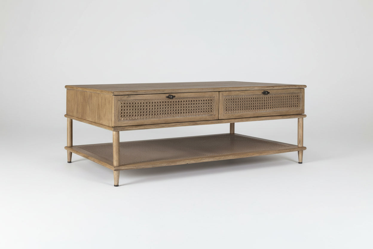 Crafted in the mid-century modern aesthetic, this coffee table showcases mindi wood solids and veneers with a warm oak finish, complemented by natural rattan cane accents. Practical storage includes one open shelf and two drawers fitted with dark gunmetal hardware, making it ideal for organizing living room essentials while maintaining a clean, sophisticated silhouette.