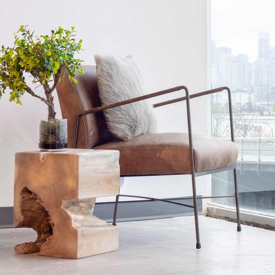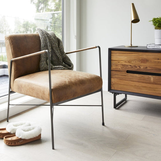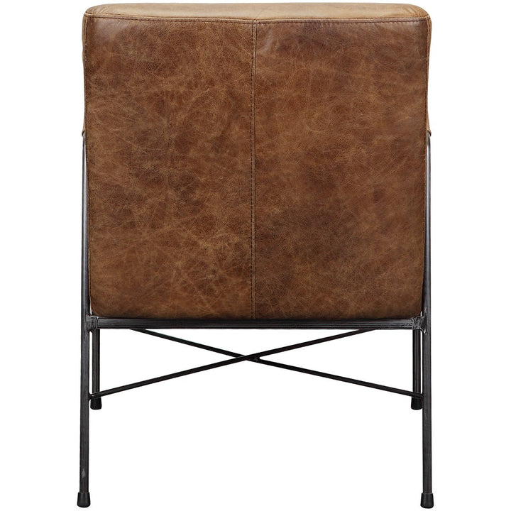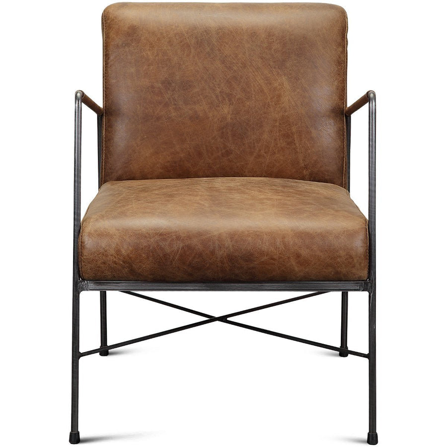 With industrial minimalist design, the rusticity of Dagwood's leather upholstery adds an inviting and well-lived-in style to the space. Supported by a slim iron frame, the tight-cushioned armchair angles back with club-style comfort.