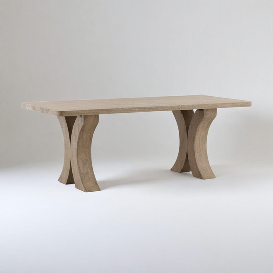 This FREEFORM SOLID CHAMCHA WOOD DINING TABLE is handcrafted from solid hardwood, meaning each piece will have its own unique grain pattern and may feature some natural occurrences like cracking and knot holes. The natural Chamcha wood color adds a organic flair to any dining room. Your selection of the table will be based on a picture of the in-stock inventory.