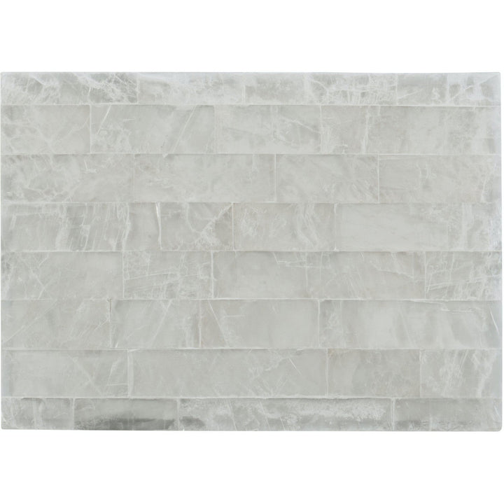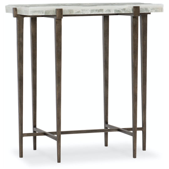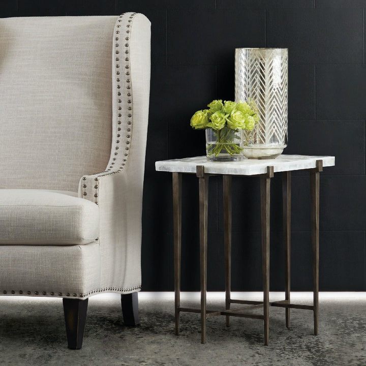 This stunning accent table has a bricked Gypsum Stone top set on a rustic iron frame.