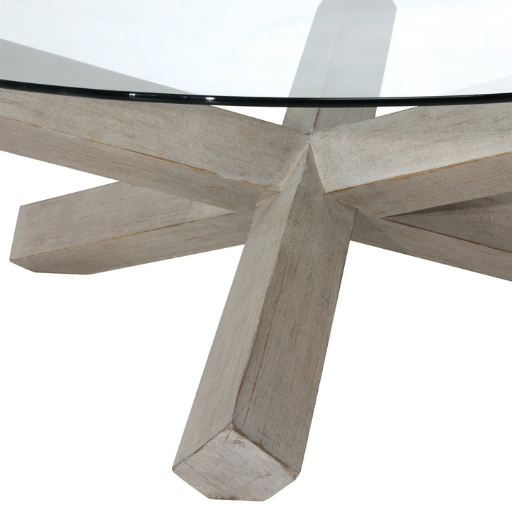 This coffee table, handcrafted from reclaimed pine wood and glass, boasts a light warm wash and distressed finish for a rustic touch. The x-base design contributes to modern aesthetics and ensures durability.