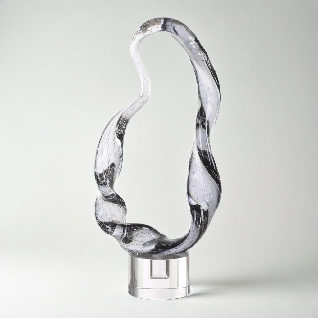 Enhance your environment with this sophisticated smoked glass sculpture resting on a crystal base. Its sleek, flowing curves embody dynamism and contemporary elegance, making it an ideal centerpiece or subtle accent. The clear glass beautifully refracts light, bringing a refined sense of luxury to any decor.