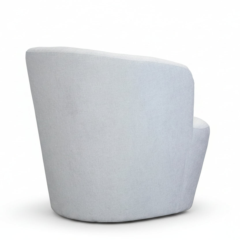 This barrel-style swivel chair combines refined aesthetics with practical performance. Upholstered in a durable, cleanable polyester fabric in soft cloud blue, it delivers both visual warmth and functional resilience. The generously curved silhouette creates an inviting seating experience, while the solid wood swivel base in matte black provides stability and contemporary contrast. An ideal choice for spaces requiring furniture that balances style with everyday wearability.