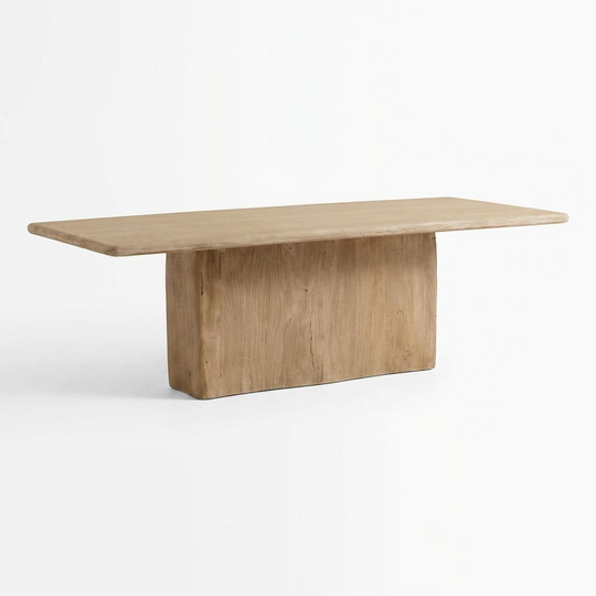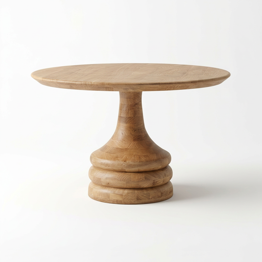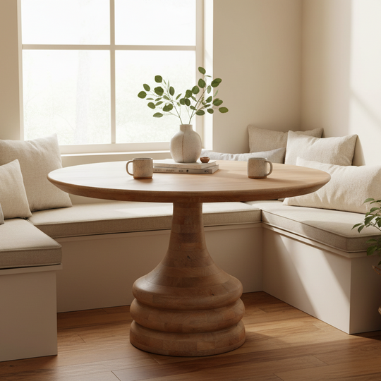 Crafted from reclaimed pine wood, this dining table has rustic elegance and timeless appeal. Featuring a carved pedestal base with a unique globe-like center and a 59” round tabletop. Finished in a beautiful, antique wash that brings out the natural grains and texture of the reclaimed wood.