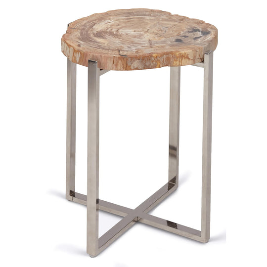 The Milo End Table features a unique petrified wood top on a geometric steel base, blending industrial and organic styles for a striking focal point.