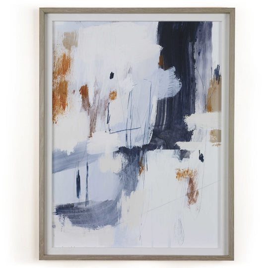 This striking, modern abstract utilizes varying shades of navy and light blue paired with bold pops of rust. The print is accented by a clean linen liner and natural pine frame with a light white wash.